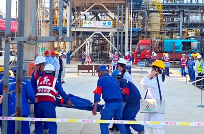 演練模擬一名工人在5米高作業(yè)平臺進行設(shè)備檢修時,因安全帶掛鉤意外脫落墜落至下方安全網(wǎng),造成左小腿骨折的緊急情況。事故發(fā)生后,現(xiàn)場安全員立即啟動應(yīng)急響應(yīng)程序。應(yīng)急指揮部在90秒內(nèi)完成預(yù)案啟動,警戒組迅速封鎖現(xiàn)場并疏散周邊作業(yè)人員,救援組攜帶專業(yè)設(shè)備抵達現(xiàn)場,醫(yī)療組同步完成急救物資準(zhǔn)備。所有行動均在設(shè)備密集的凈化裝置區(qū)完成,各小組協(xié)同配合在最短時間內(nèi)完成了救援任務(wù)。