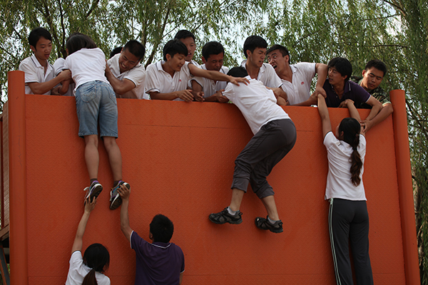 翻越逃生墻。我們的口號是“不能讓一個人掉隊”